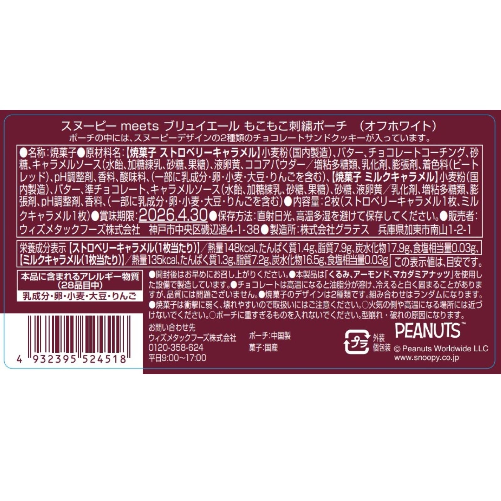 オフホワイトのスヌーピーもこもこ刺繍ポーチ。中には、スヌーピーデザインの焼菓子2種類(各1枚)が入っています。ほろっとしたビスキュイと、とろっとしたキャラメルフィリングチョコレートの美味しいハーモニーが楽しめます。