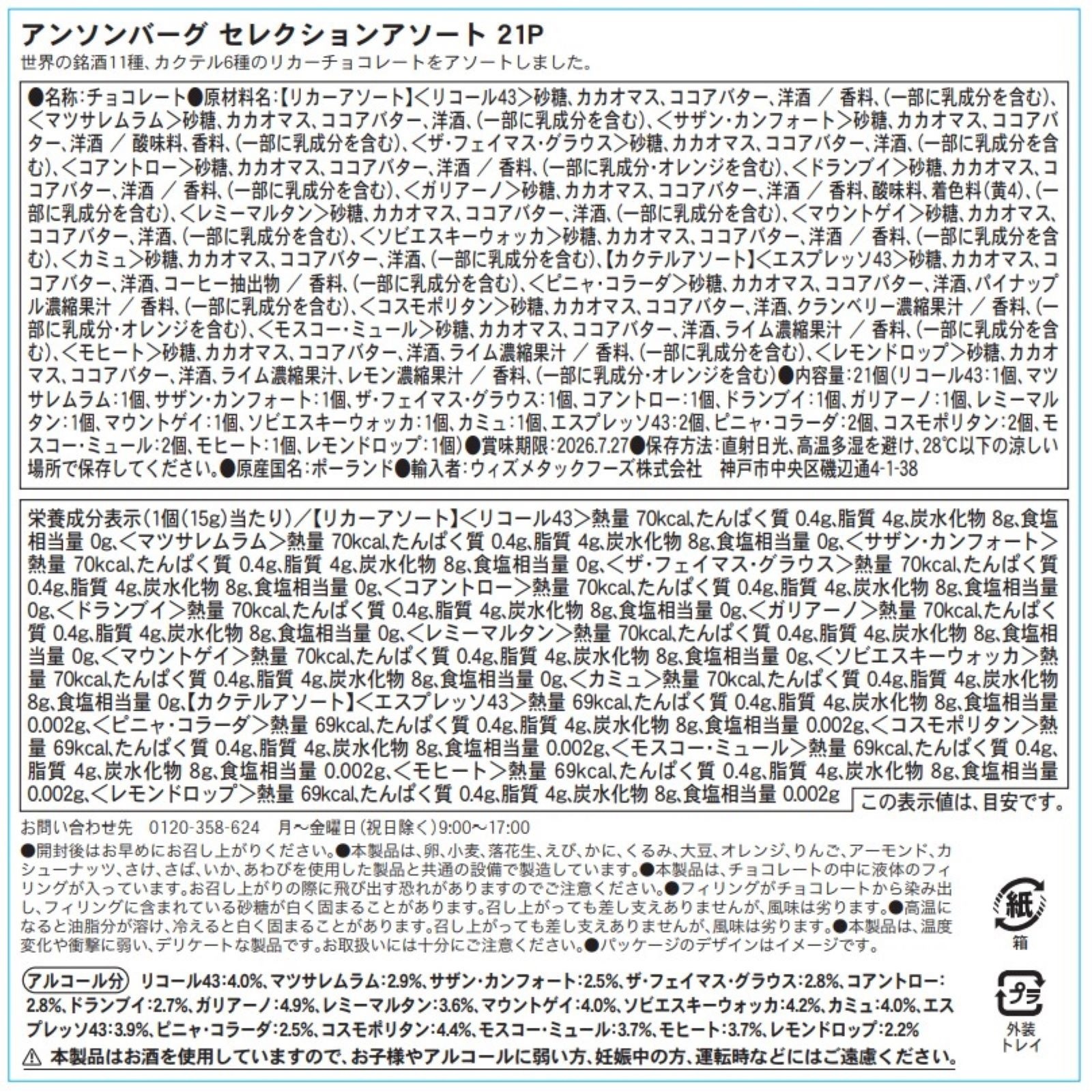 | 内容 | モスコー・ミュール、ピニャ・コラーダ、コスモポリタン、エスプレッソ43×各2、ザ・フェイマス・グラウス、カミュボルドリーVSOP、マツサレムラム、コアントロー、レミーマルタン、マウントゲイ、ドランブイ、ソビエスキー、サザン・カンフォート、レモンドロップ、リコール43、ガリアーノ、モヒート×各1 |
