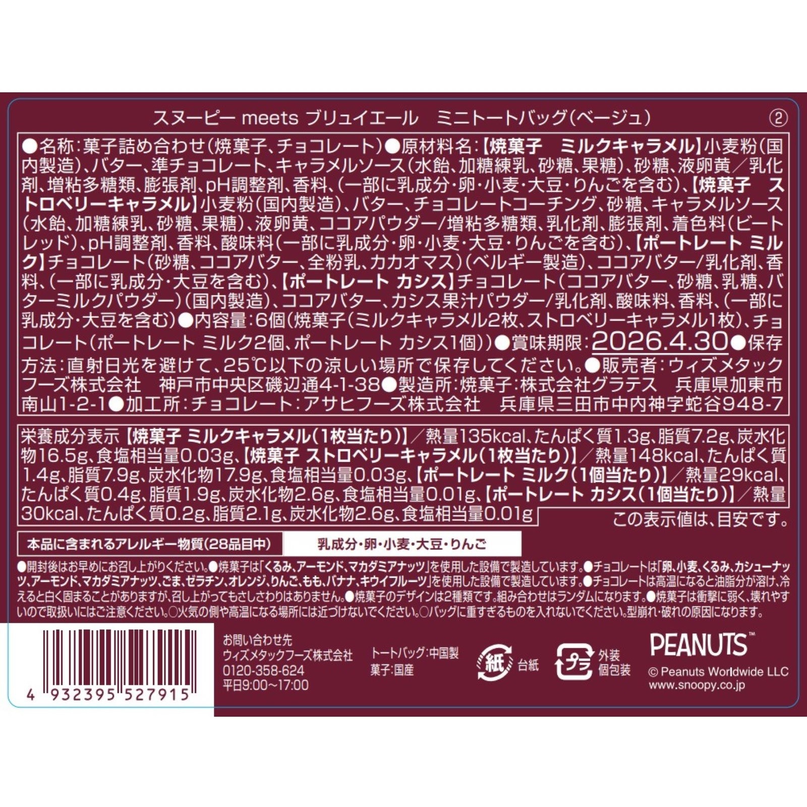 プレーン生地の焼菓子に、ミルクキャラメルフィリング入りのチョコレートをサンドした「ビスキュイサンド・ミルクキャラメル」(2枚)、ココア生地の焼菓子に、キャラメルフィリング入りのストロベリーチョコレートをサンドした「ビスキュイサンド・ストロベリーキャラメル」(1枚)。スヌーピーのポートレートデザインが素敵な個包装チョコレート(ミルクチョコレート2個、カシスチョコレート1個)。