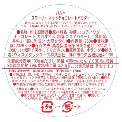 星やハート型のシェイプチョコ入りで、カップに浮かんだ星やハートチョコの見た目も楽しめるホットチョコレートミックスです。脱脂ココアを使わず、脂肪分入りのココアパウダーを使うことにこだわり、コクのある味に仕上げました。
